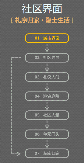 归家路线设计秉持整体游览体验去营销化,打造所见即所得美好生活场景的理念。三大立体层级空间递进,由喧闹的城市界面到幽静私密的社区空间,打造高端私密社区。