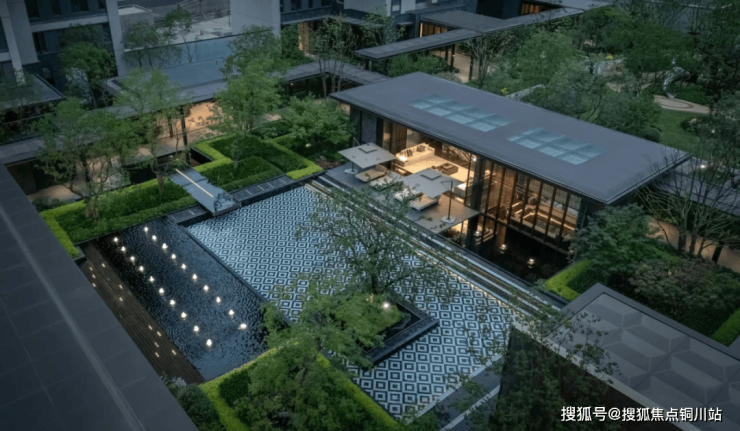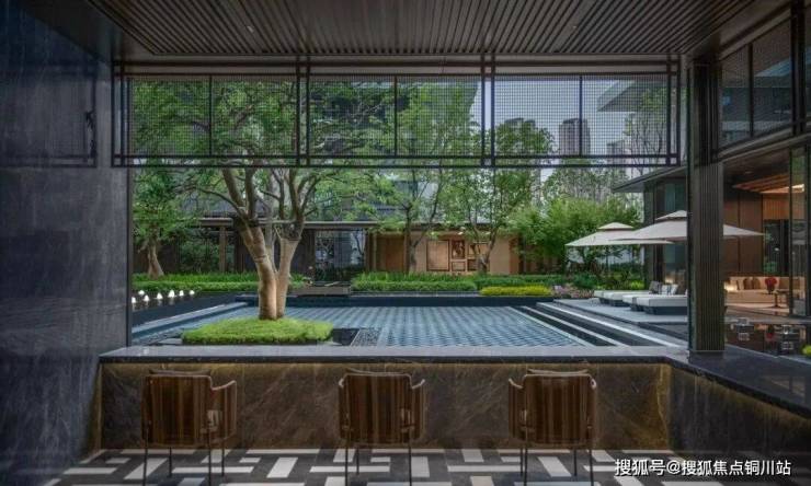 叠影之庭——设计灵感源于“江中晨雾”的层次感,在庭院中央孤植一棵迎宾姿态的乔木。江面泛起的涟漪被抽象为层层叠级的水台,各异的水面高差映衬出错落有致的树影。庭院因此得名“叠影”。