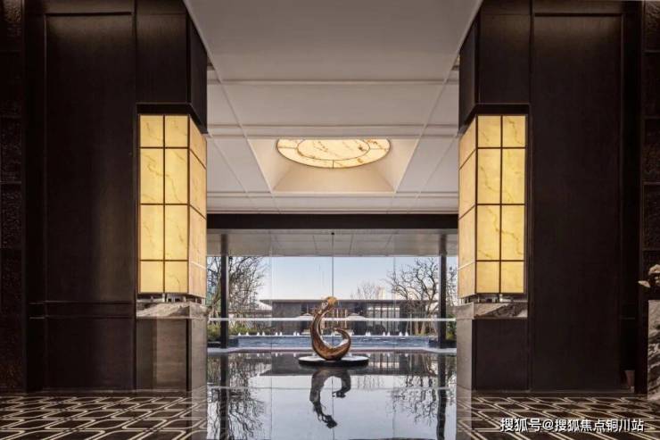 首层单元大堂与风雨连廊的设计风格和谐统一,运用仿石砖镶嵌金属条的设计手法,在电动门两侧布置发光云石灯柱,并在顶部吊顶安装星光顶,既提升了场域特性,又增强了昭示性。议事厅两侧结合单元入口,分别布置了两个小巧精致的庭院,加之景观水帘和金属网帘的搭配,为入口和架空层营造出更多自由与愉悦的氛围。