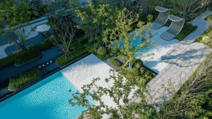同时,诸如业主会客区、儿童活动区、室外泳池能实用“元素”被巧妙融合在景观之中,设计的一致性和延伸性做到了近乎完美的地步。
