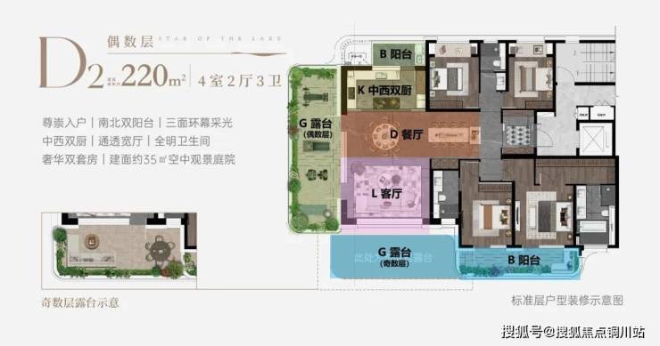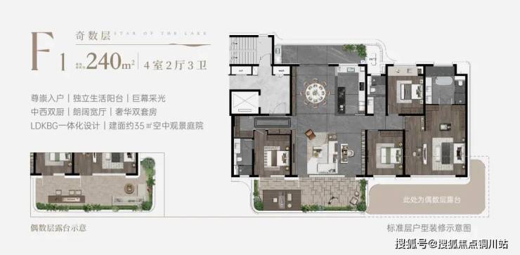 偶数层,则享有建面约35㎡的侧边露台,搭配南北阳台,实现270°三面瞰景的纯粹观景面。