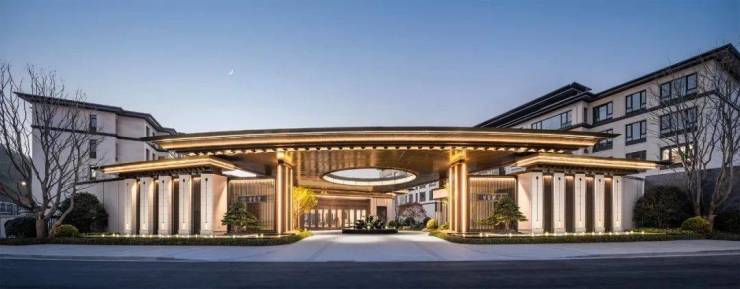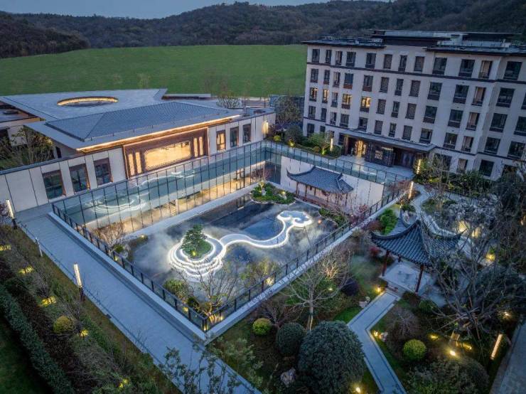 入口连廊处打造举目天地的“星空穹顶”,穹顶下方的“莲花盏”主题水景,层层叠水,被绿植环绕,令人耳目一新的同时,也隐喻着星空下,山水气象交融中,有一朵传世莲花绽放。