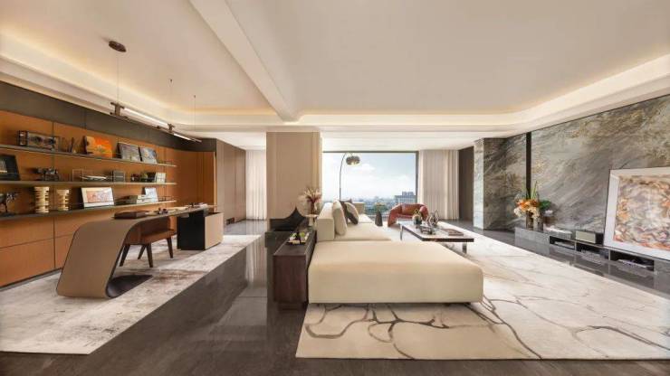 设计师还巧妙利用“横向延展+纵向通透”的复合策略,将传统豪宅的“厅室分离”升维为“无界交互场域”——父母在厨房备餐时可与客厅玩耍的孩子互动,书房与客厅的玻璃隔断则兼顾办公隐私与家庭陪伴。