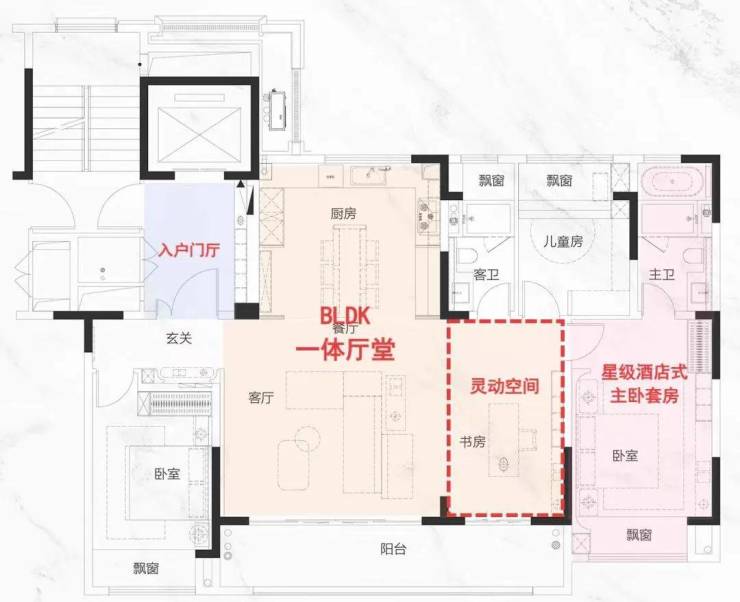 在户型设计上,在空间维度突破的加持下,创新的BLDK(阳台-客厅-餐厅-厨房)一体化设计,打造约40㎡洄游式阔厅,打破传统割裂,促进家庭互动。