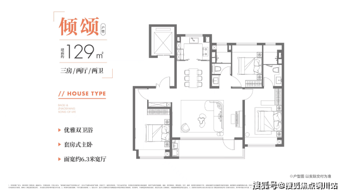 建面约129㎡三房两厅两卫户型,拥有面宽约6.3米的大横厅和约1.6米进深的双阳台。