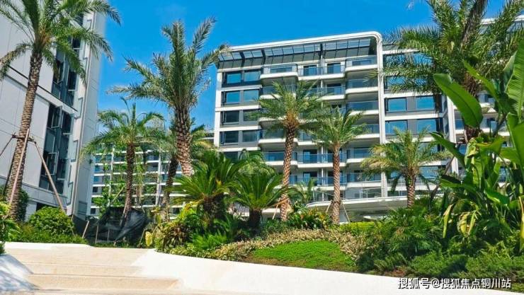 穿过挑空门庭大堂,眼前豁然开朗,拾阶向上,就见棕影婆娑:一株株或孤植或群植的加拿利海枣,各自随性舒展枝叶,构建出一处处诗画般的热带海岛谧境。