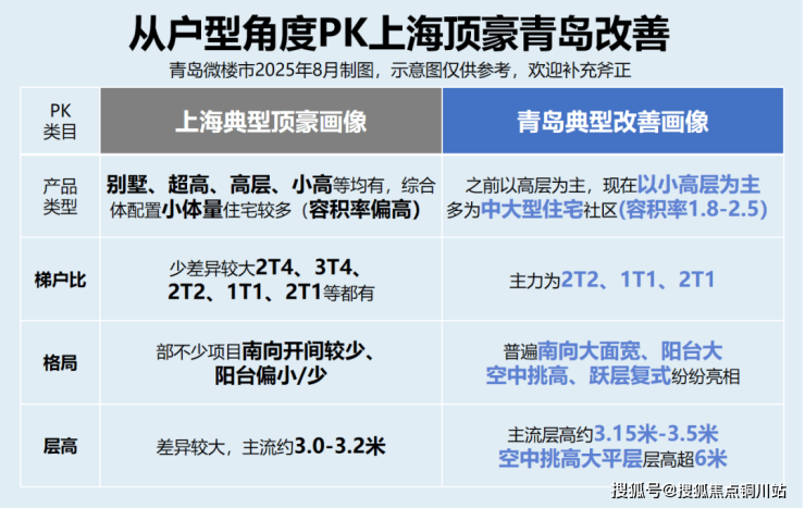 第一,产品类型差异,注定了生活品质的分野。上海许多顶豪为混合型住区,住宅、商办、公寓、租赁住宅等在同一小区,住宅体量往往较小,容积率普遍较高。而青岛改善,以纯粹住宅为主,主流容积率约1.8-2.5,居住品质更佳。