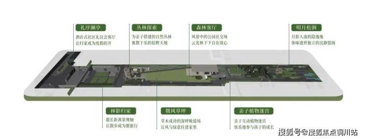 社区园林由一横一纵两条主轴构成,横轴为贯穿东西的主轴,连接着社区的主要出入口和多个活动功能区,纵轴为悠闲的慢行步道,串联起各种精致的景观节点与休闲功能区。社区园林内设置【礼序澜庭】、【林影廊桥】、【丛林探索】、【微风草坪】、【森林客厅】、【亲子植物迷宫】、【明月松涧】、【疗愈庭院】、【健体公园】、【童趣空间】、【康体花园】等功能板块,为业主打造全龄友