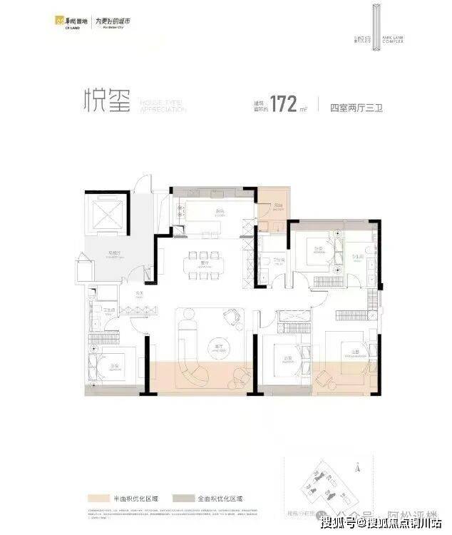 建面约172平的四房三卫户型:超16米南向大开间,约62平一体化餐客厅,双主卧套房,媲美空中别墅的居住体验,是终极改善的王炸户型。