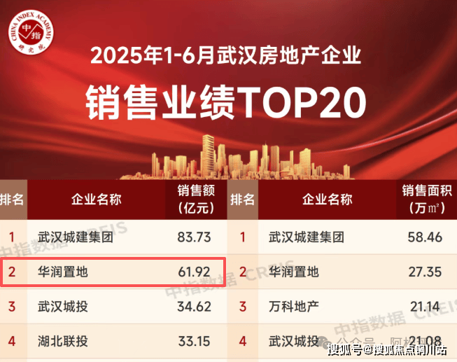 根据中指院相关统计显示,在今年上半年武汉房企销售业绩榜中,华润置地以61.92亿元位列第二,仅次于武汉城建集团。
