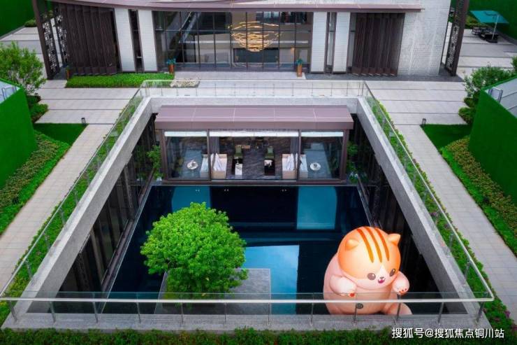 各个功能空间,围绕庭院式中庭布局,一只向上攀爬的超大猫咪玩偶,憨态可掬,既有着当下都市的潮流感,又看起来格外亲和,拉近了这处会所与业主之间的距离。
