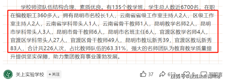 学校官微显示,关上实验学校拥有昆明市名校长1人,省级工作室主持人2人,区级工作室主持人2人,省学科带头人1人,省骨干教师1人,昆明教学名师2人,昆明市学科带头人3人,昆明市骨干教师6人,昆明市名班主任6人…