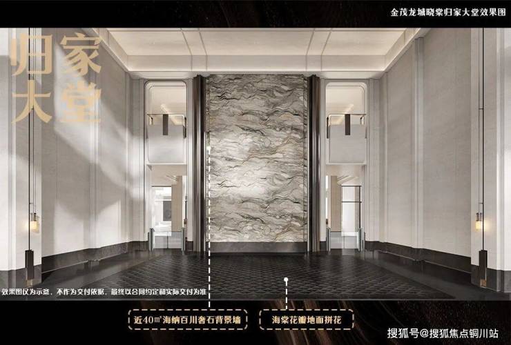 项目的归家大堂以约10米双层挑高,构筑宏伟仪式空间,让整个大堂的贵感拉满。近40㎡超大背景墙,取意“海纳百川”之意,彰显入户尊崇与显赫气度。地面拼花暗嵌晓棠符号,于不经意间传递文化底蕴与人文共鸣,诠释当代奢居的深度思考。