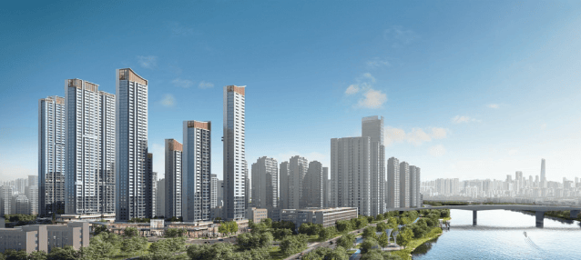 建筑设计:采用半围合式组团布局,将开放式绿地公园和现代感公建立面以及周边街区有机融合,围绕 SuperFlat 风格来进行建筑设计,打造具有现代感、艺术感的公建化住宅立面,整体采用大面玻璃幕墙及铝板,形成晶莹通透的视觉观感,建筑顶部采用棕色格栅多层次造型,沿江的几栋高楼顶部则采用 “风帆” 造型。