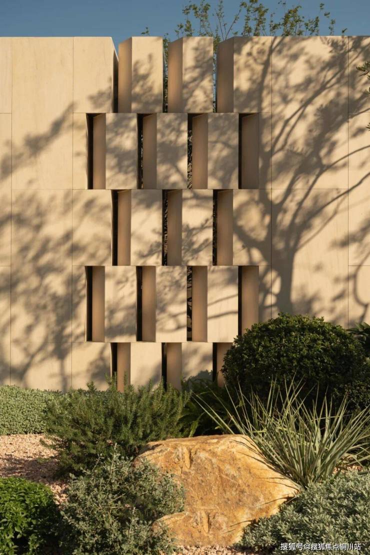 提取建筑形式语言-精制45°斜角设计融入空间中;极致简约的体块关系设计,通过纯粹的几何形态、有序的排列、虚实对比,与前方灰绿色调的植物融合,形成简洁、现代且富有艺术感的视觉效果;