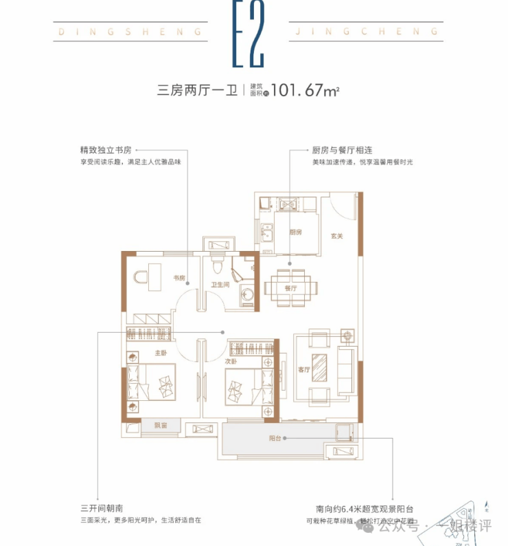建面约101平 三房两厅一卫:这个户型是非常方正的三房,做到了三开间朝南,连廊结构可实现南北通透的效果。关键是这个户型动静分区做得很好。