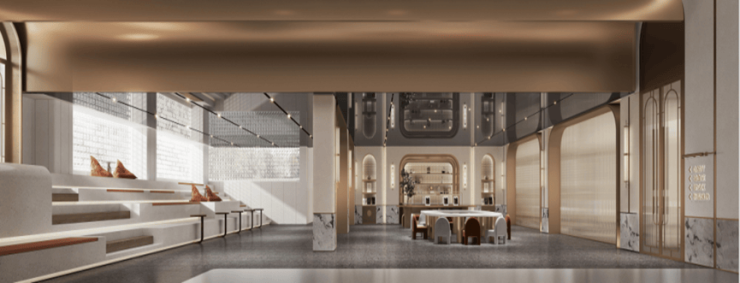商务社交会所一楼空间旨在营造一种‘无边’意境,入口以石阶引导,内部动线设计迂回曲折,整体风格精巧典雅。