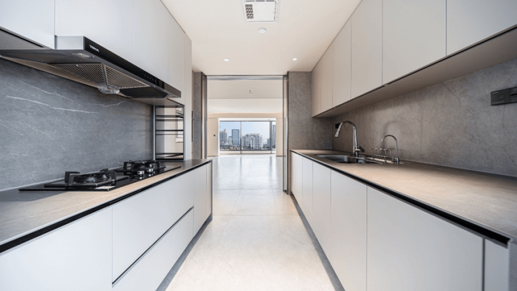 2号楼168㎡、172㎡两个户型的餐厨衔接区域,预留了充足岛台和餐边柜收纳空间。