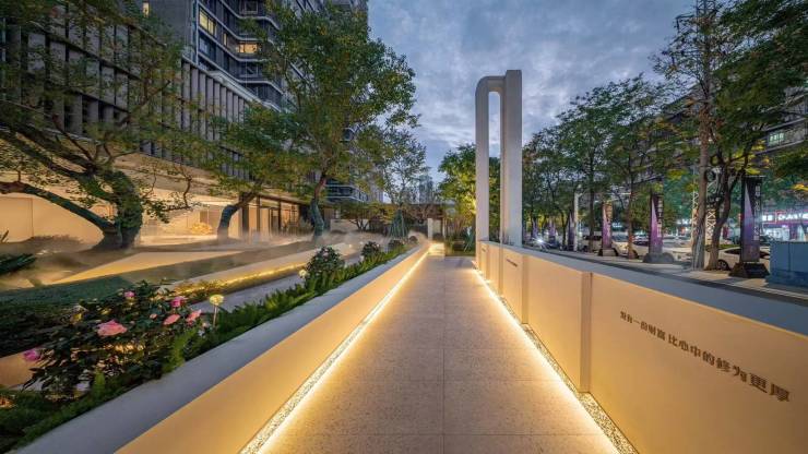 社区整体抬高约3米,四方院墙环绕于项目外围,通过实墙与金属材质的融合,打造出半通透半围合的视觉效果,高约4.5米的景观墙,传递出一种"大隐隐于市"的生活态度,同时私密性也得到了提升。