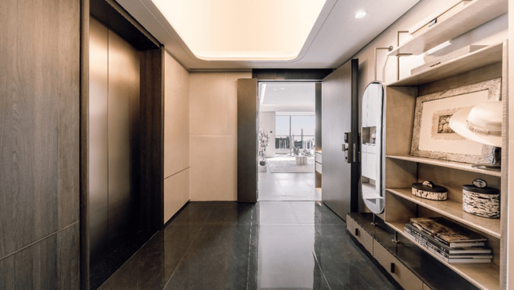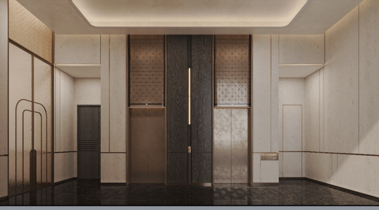 首先看玄关,为了回应其对归家私密和外玄关收纳的诉求,采用双侧开门贯通电梯,实际使用效果为两梯一户,同层业主入户动线互不打扰,让每位业主独享约17㎡电梯前室。