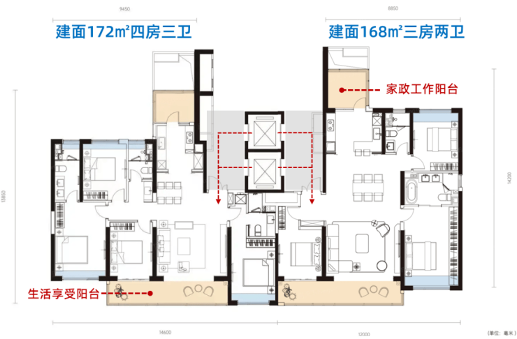 目前1号楼即将售罄,以主要在售的2号楼168㎡、172㎡户型为例。