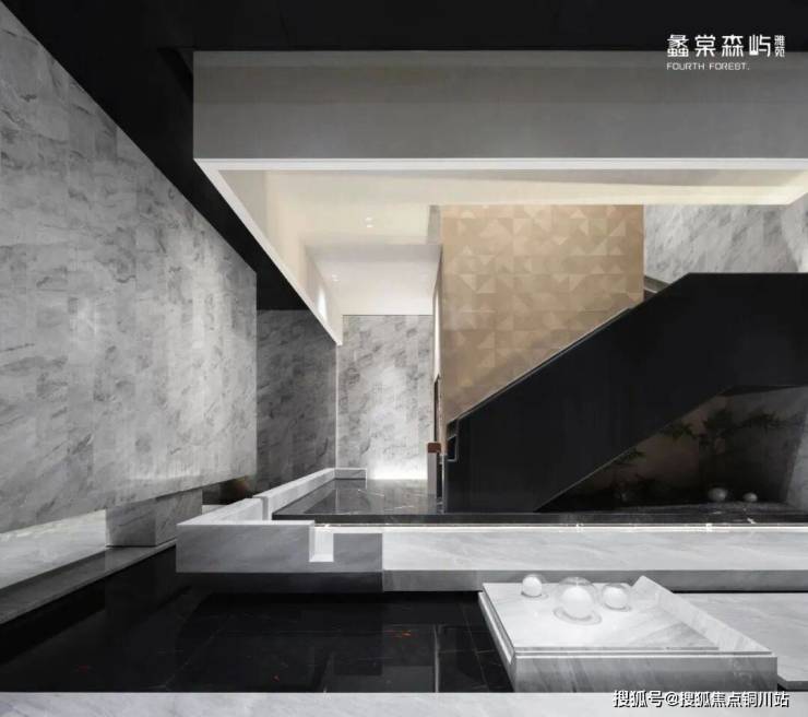 在实景呈现的全维示范区中,约80m宽、9m高的纯白拱门采用白玉兰天然石材进行了几何体块的构筑,城市喧器在此悄然退场,唯留一场尊崇序章。