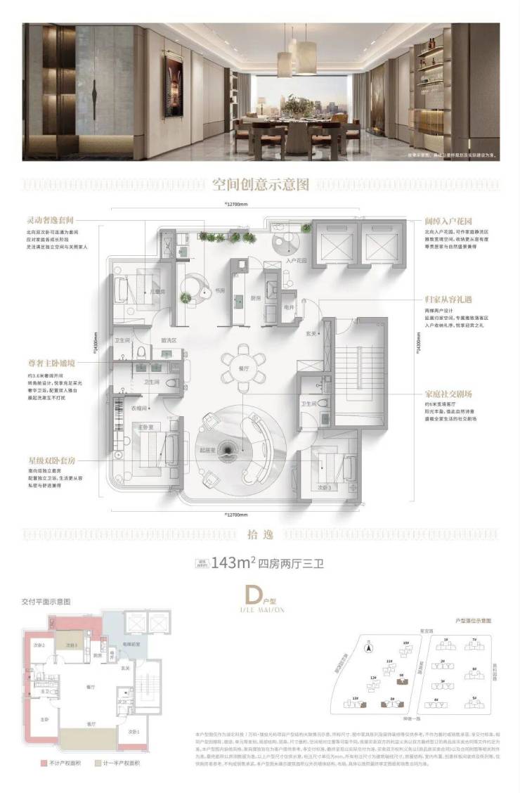 建面约143㎡:进阶改善标杆户型!独梯独户,私享全明电梯厅,实际使用面积可达约157㎡,直逼大平层!无论是尺度感还是居住舒适度,都贴合光谷高知人群的改善标准。