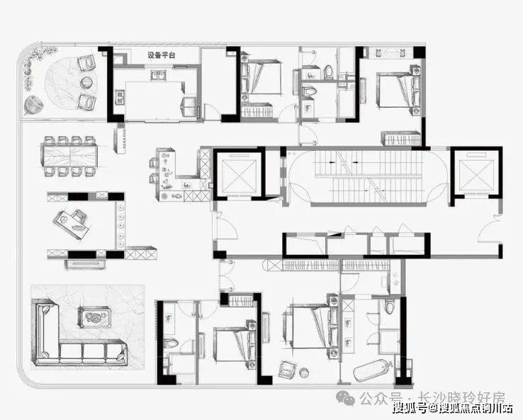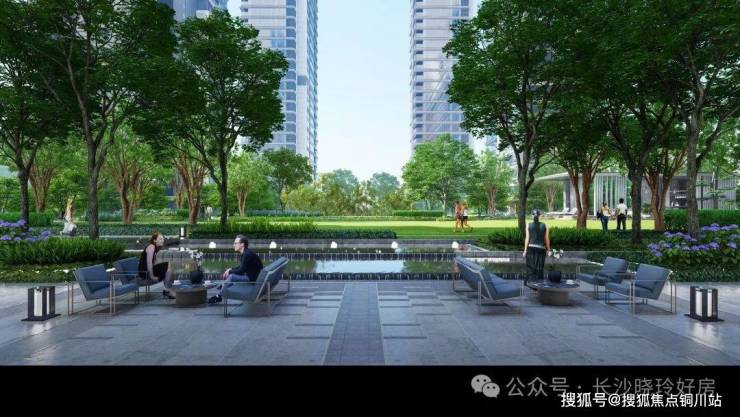 中央庭院:串联起山体花园、下沉度假泳池、中央车站、功能会所、晴雨廊巷、潇湘楼阁和架空层等园区公共生活配套,构成一个更为丰富、立体的社区生活体系。