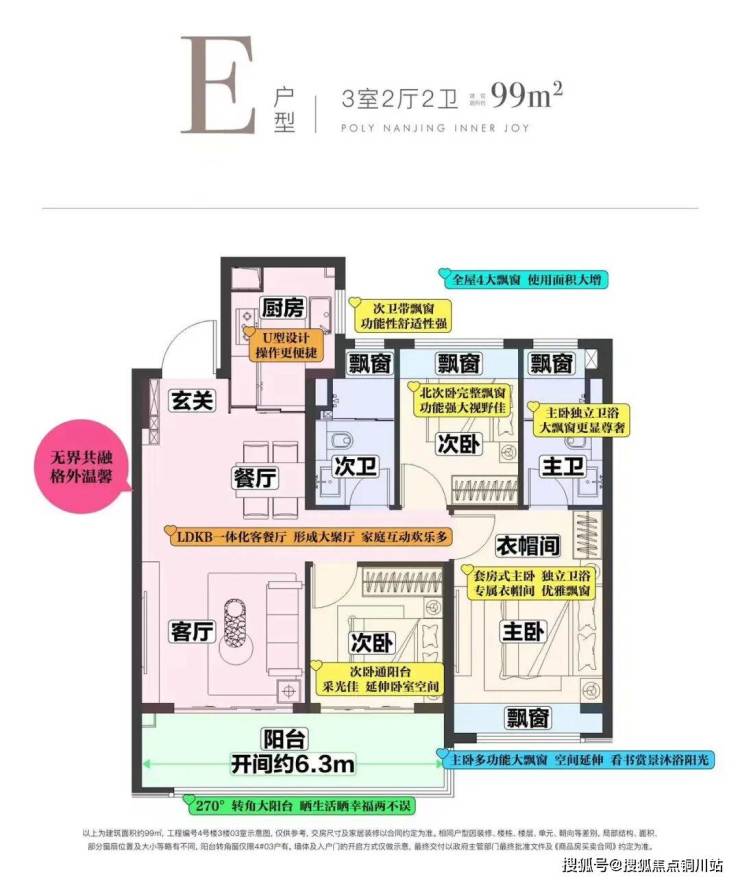 建筑面积约99㎡三房两厅两卫:14、16号楼的中间户,约6.3米双阳台+270°转角大阳台,主卧套房式设计,独立卫生间。
