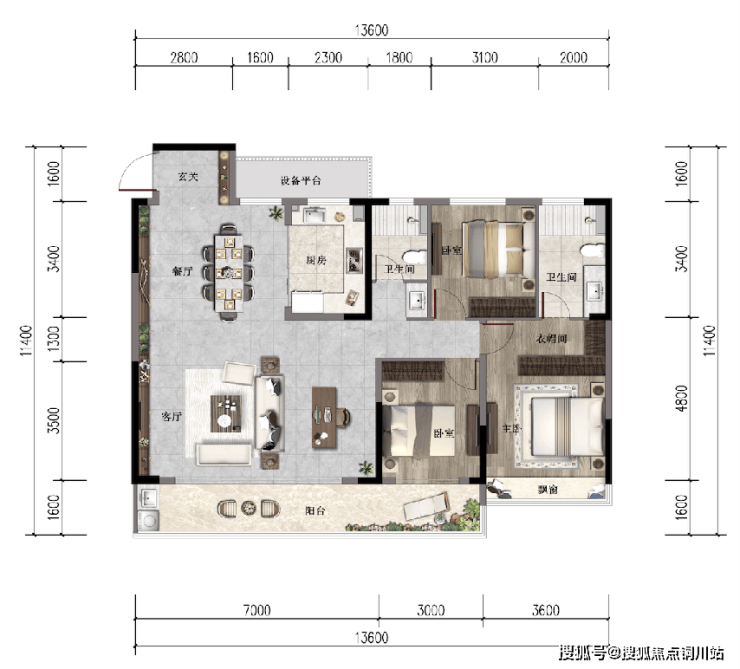 四开间朝南,约13.6m超大面宽+超大无柱横厅,拥有近34㎡的客厅面积,这才是豪宅格局。