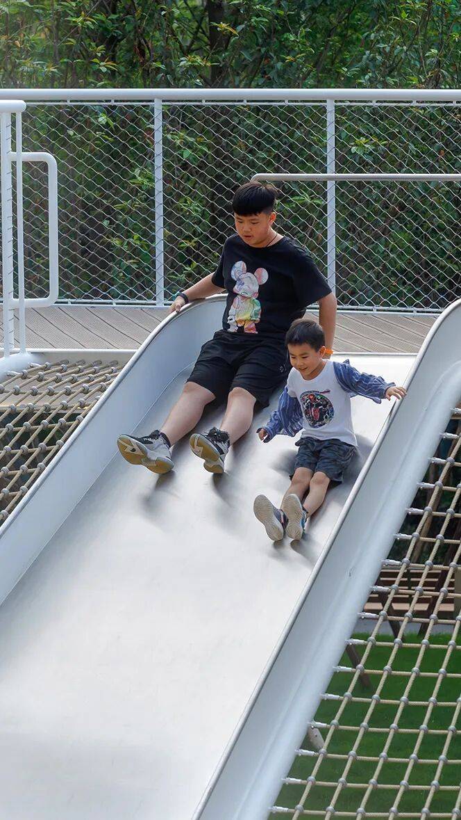 两侧的攀岩坡道,能够锻炼孩子们的勇气。成长就是不断攀爬向上的过程,累了停下歇歇也没关系,半路的风景也不错。