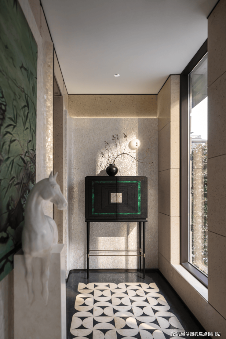 目之所及,是白玉汉马的精神与楚绣文化的灵魂碰撞,轻巧精致的楚漆玄关柜,由楚汉地区独有的大漆工艺制作而成,坚硬的石材与质地柔软的漆器、楚绣,在光影韵律中静候每一位归家者,恰到好处的尺寸比例,解构着这座城市的雅与奢,更诉说着现代东方的隐与逸。