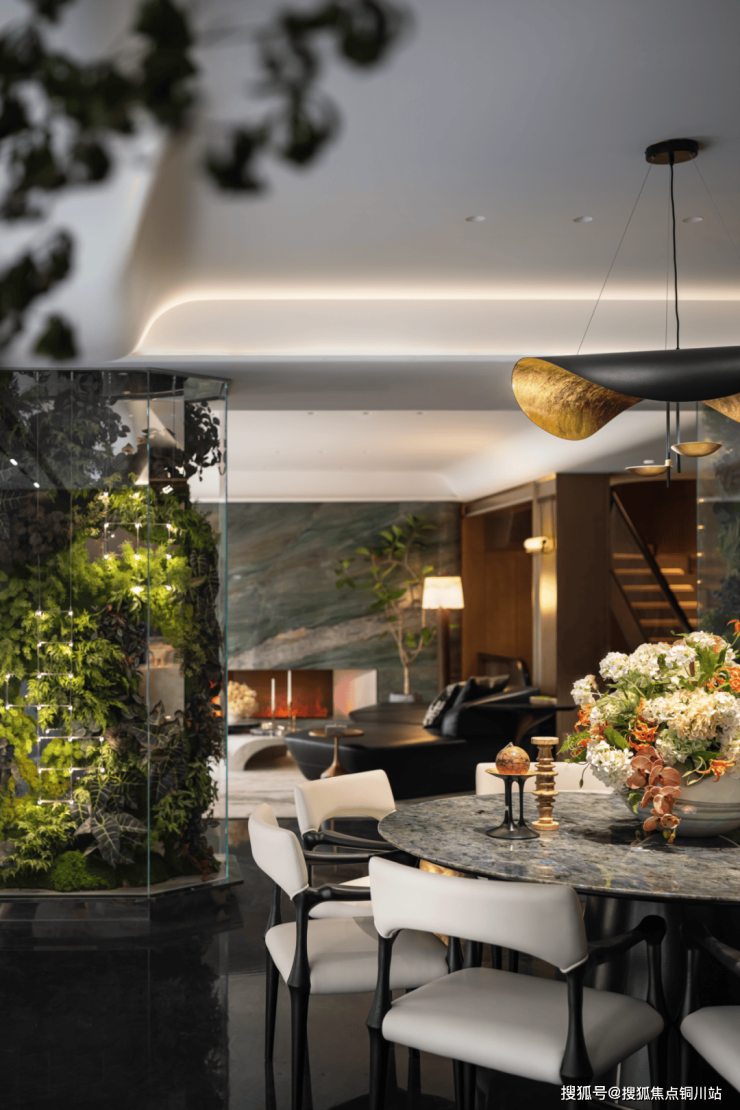 客厅以黑白为底,将江城山水化作空间的设计亮点。两处玻璃绿植屏风,层叠枝叶如一幅山水卷轴,将自然苍翠裁入一室。