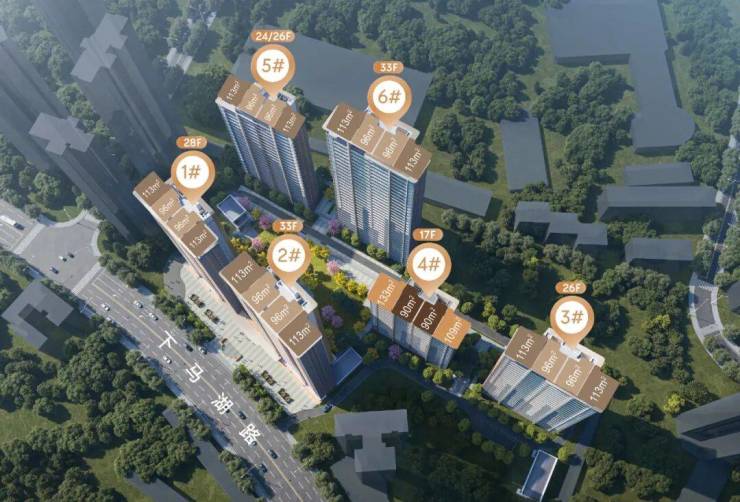 项目容积率约为3.0,由6栋17-33层住宅楼组成,绿化率约30%。在主城核心区,这样的规划恰到好处的兼顾了建筑密度与居住舒适度,同时确保了楼栋间的视野开阔与通风采光良好。