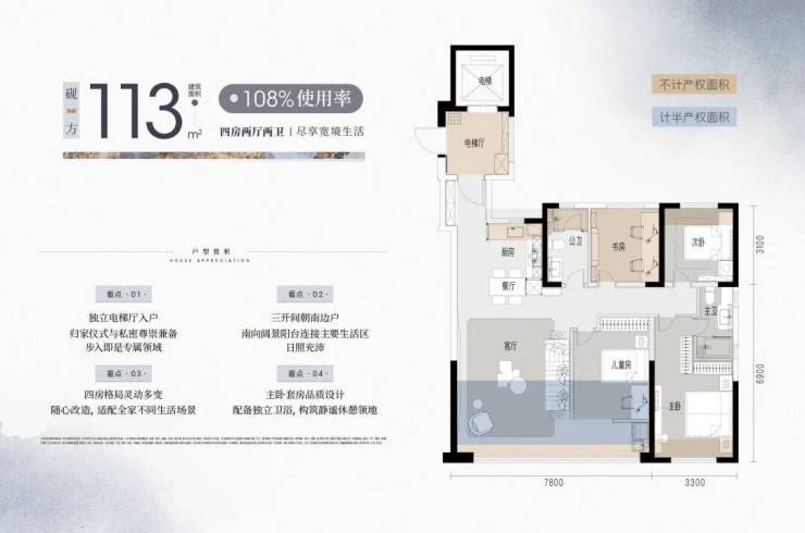 首开的1#楼主推约96㎡三房和113㎡四房的毛坯高层产品,而在传统高层住宅中,得房率通常在75%-80%左右,而一方砚通过创新设计,显著提升了空间的使用效率,使户型实现了较高的空间拓展率: