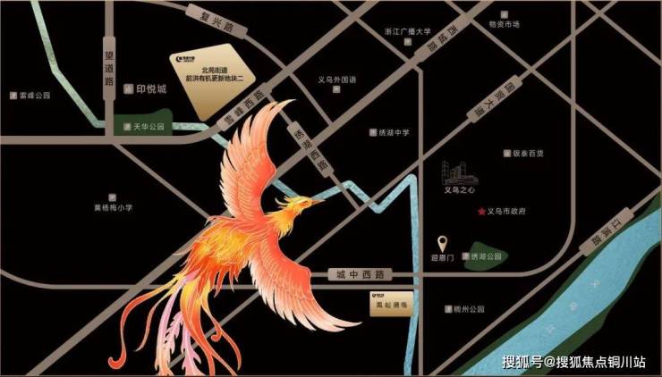 摊开义乌地图就能看到,以古老的迎恩门为中心,与市政府间,划出一道直线,构成一条主轴,两边再像凤凰一样双翅延展开来,一个天然的工整对仗出现了——