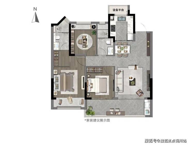 比如,主卧套间,还有270°瞰景飘窗,可以享受来自两面的阳光沐浴,加上主卫飘窗,形成东、南、北三面采光。