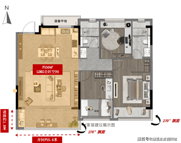 与横厅等宽、约5.6米的阳台,进深约1.8米,比传统大平层1.6米的进深,多出了0.2米,实用面积更大,整体空间达到约11㎡。