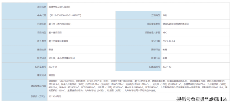 据悉,嘉福学校及幼儿园的报建信息显示,项目总投约3.52亿,总用地面积约27951.9㎡,总建筑面积约54673㎡,规划九年制学校(54班)、幼儿园(12班),九年制学校两个子地块架设空中连廊连通。