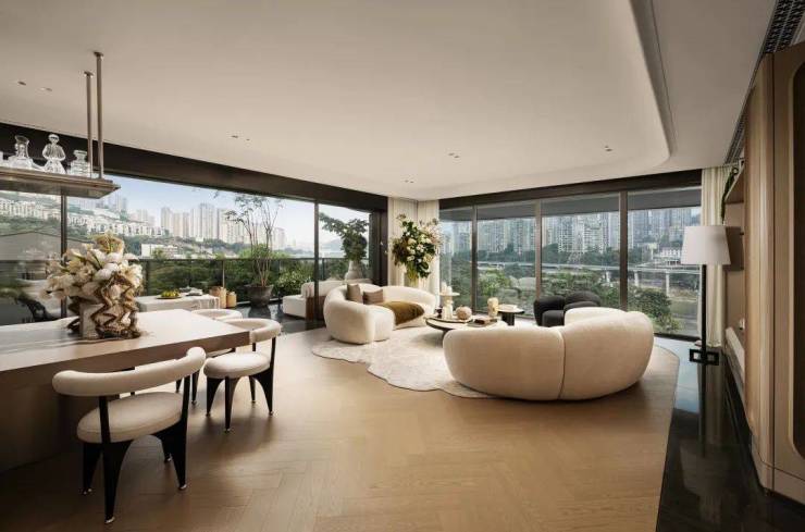 采用无立柱转角设计,搭配经典大端厅,在嘉宸看来,比起物理层面的宽奢,户外极致江景更为奢贵,11米的超大露台,形成向户外延展的视觉空间,真正实现了内外江景之美的无界交融。