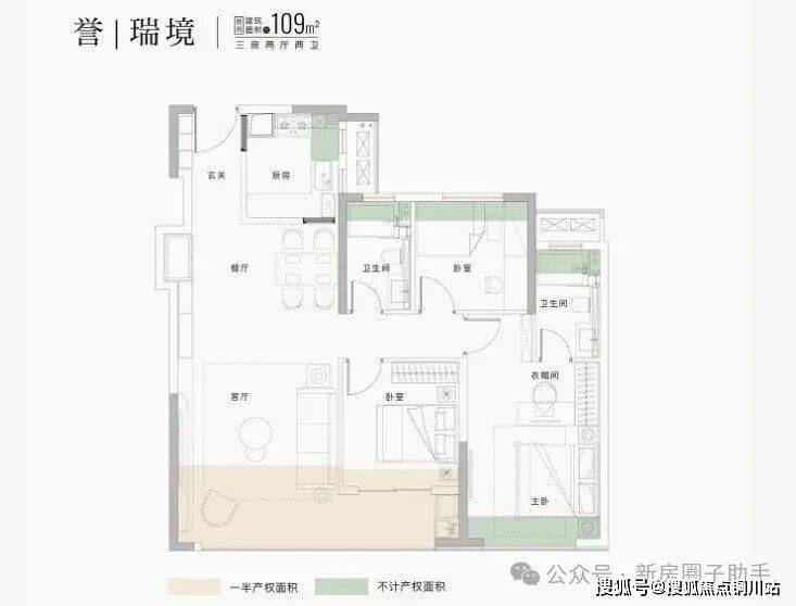 建面约109㎡三房,连廊中间户,算是比较常规的户型了,不过每个房间空间都很大,主卧都有约20平。