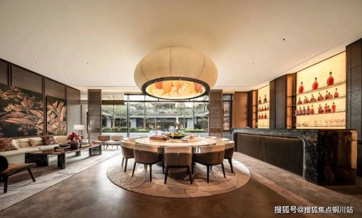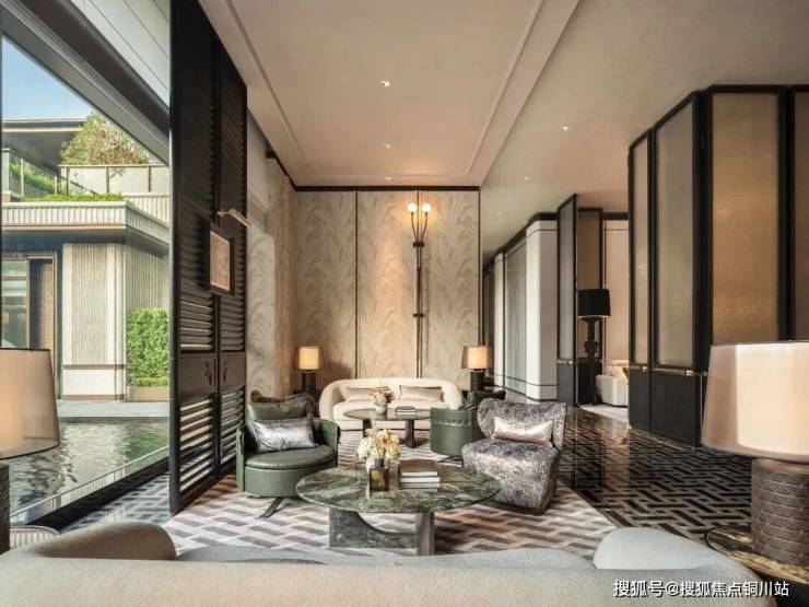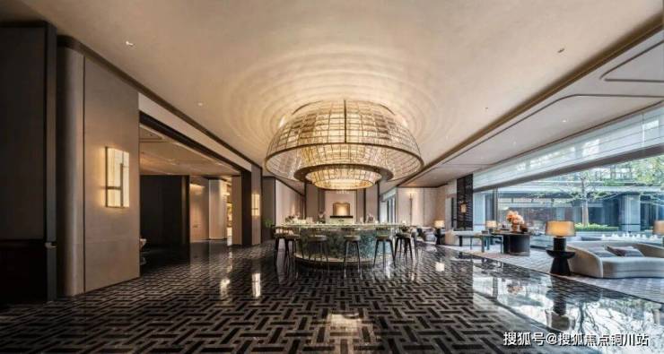 会所大堂当然也是正对着下沉式庭院。紫金·翡丽甲第选用的落地窗,最大的一扇落地窗达到了7.7米宽,把下沉式庭院的水光和天光,无限收入室内。到了晚上,空中会弥漫着鎏金岁月的气息,泳池中的那轮圆月,就在你眼前,照耀着在月光中畅游碧波的人。