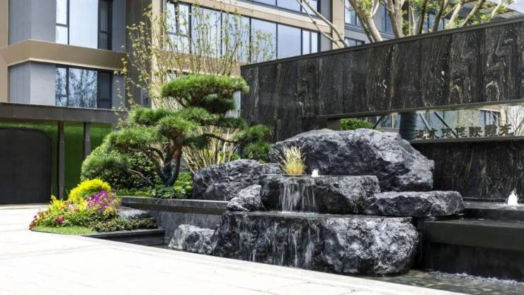 景观示范区核心处,一面水景墙映入眼帘,它采用巴西进口的 “宇宙金” 大理石,底色神秘深邃,独特的金色脉络璀璨奢华,尽显非凡格调。