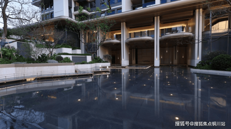 轴线感的景观布局,精选的贝金米黄定制石材,在静谧水景的倒映中,勾勒出极具秩序感与艺术感的迎宾画面。