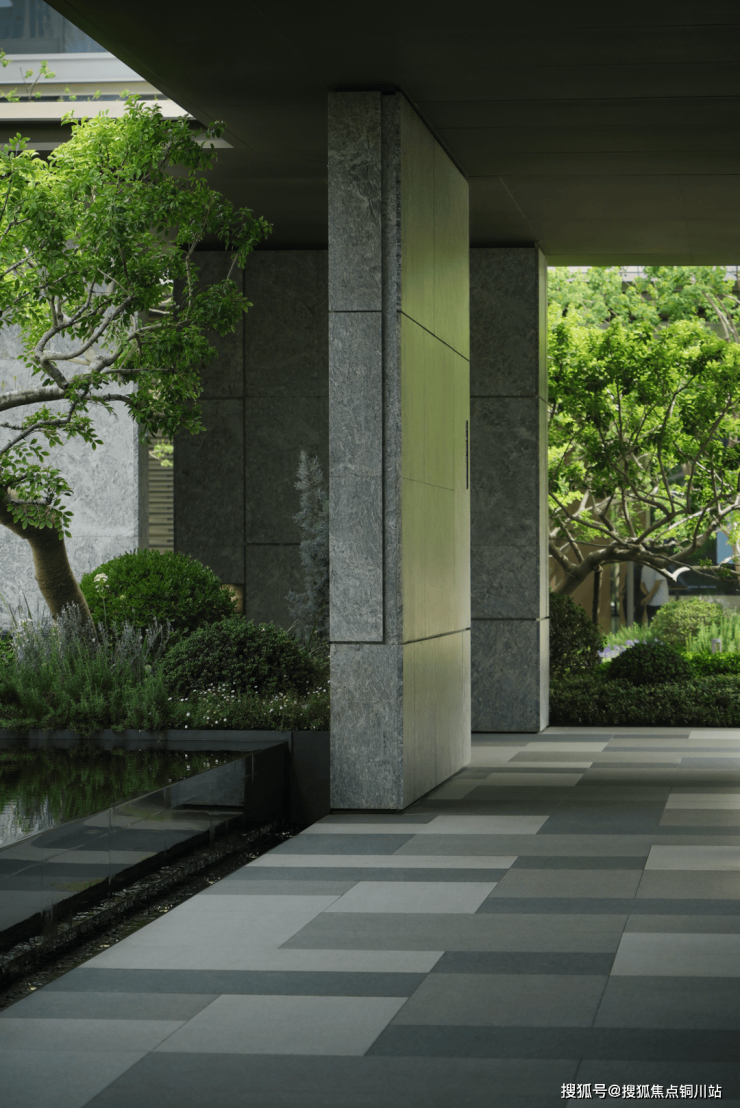 设计有意以此境的方正水庭对话秩序中正的都市氛围,以此为始,让舒展的绿意逐渐渗透廊下,消弭人与自然的边界感,开启第一重归家体验。穿行于细节以美学比例分割的廊下景墙,履迹肌理如抽象艺术般的地面铺装,体察误入尘林般的喜悦。