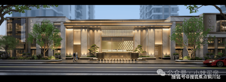 项目主入口以宽悬挑雨棚打造环岛式落客区,轻松便勾勒出度假酒店式的松弛氛围。