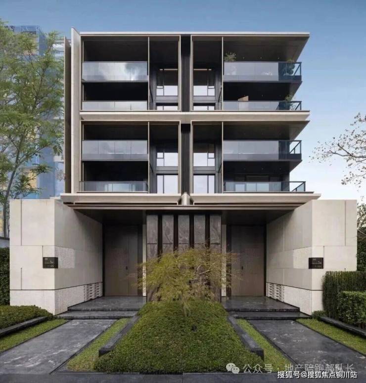 叠墅建筑立面材料则以石材+香槟金色铝线条为主,首层层高3.9米,常规楼层层高3.5米,私梯入户,下叠带花园。