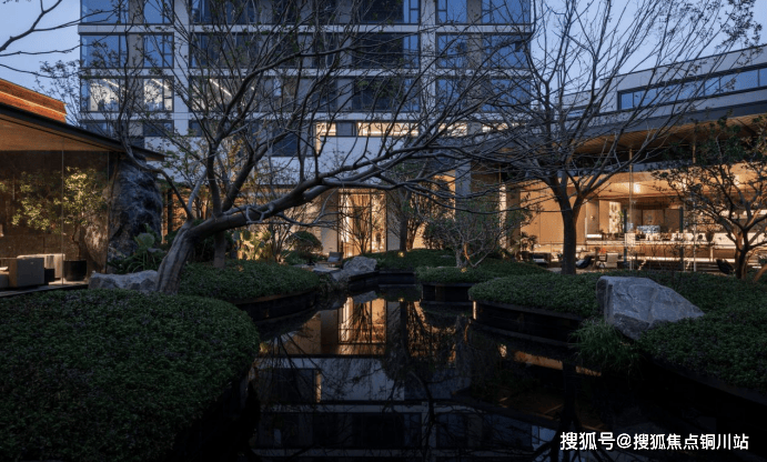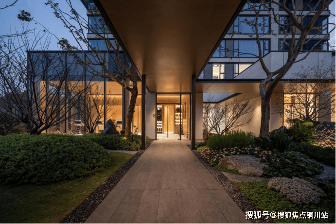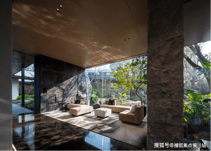 以超长景墙代替传统围墙,第一眼望去,掩映于茂密绿植之中的门头,犹如一座在街头的开放式花园隐蔽入口。步入其内,风雨连廊、叠瀑流水、珍稀乔木、近1000吨原山石材组成的围合式园林,将项目“大隐于市”。