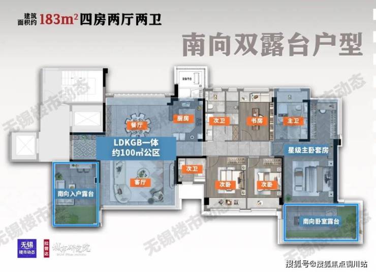 以建面约183㎡为例,这个户型有2种布局,一种南向双露台,一种南北双露台。我们先看第一种,建面约183㎡四房两厅两卫,南向双露台格局,重点增强第二会客厅和卧室私享花园的功能营造。