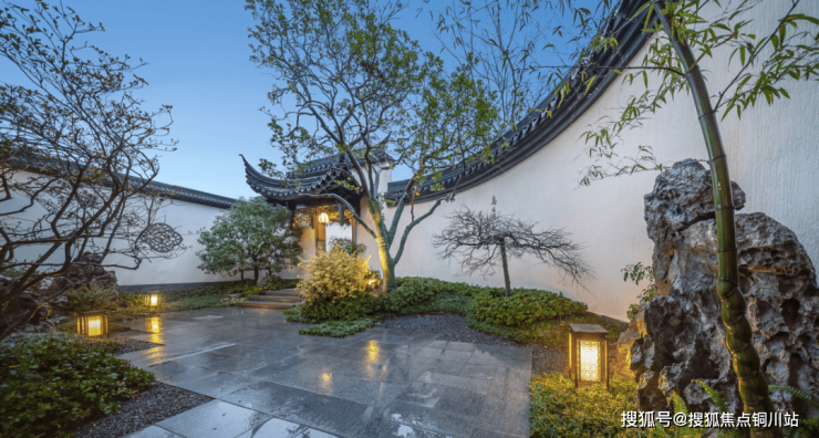 每一个单元入户配备特色中式平台,两侧配置层次丰富的植物组团,匠心打造精致枯山水小景。